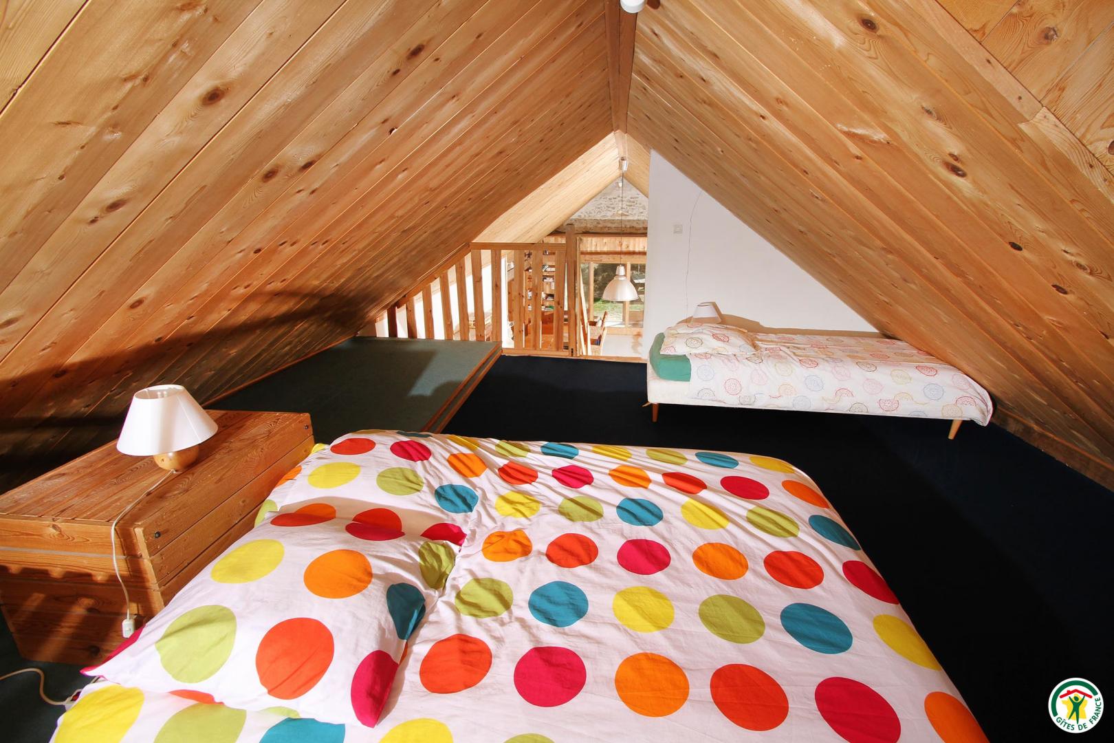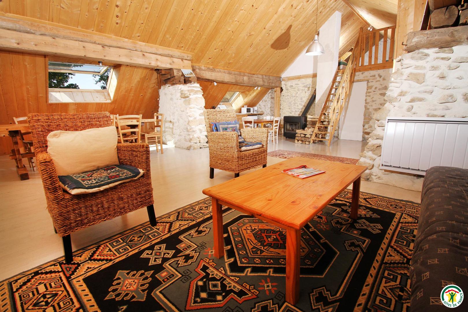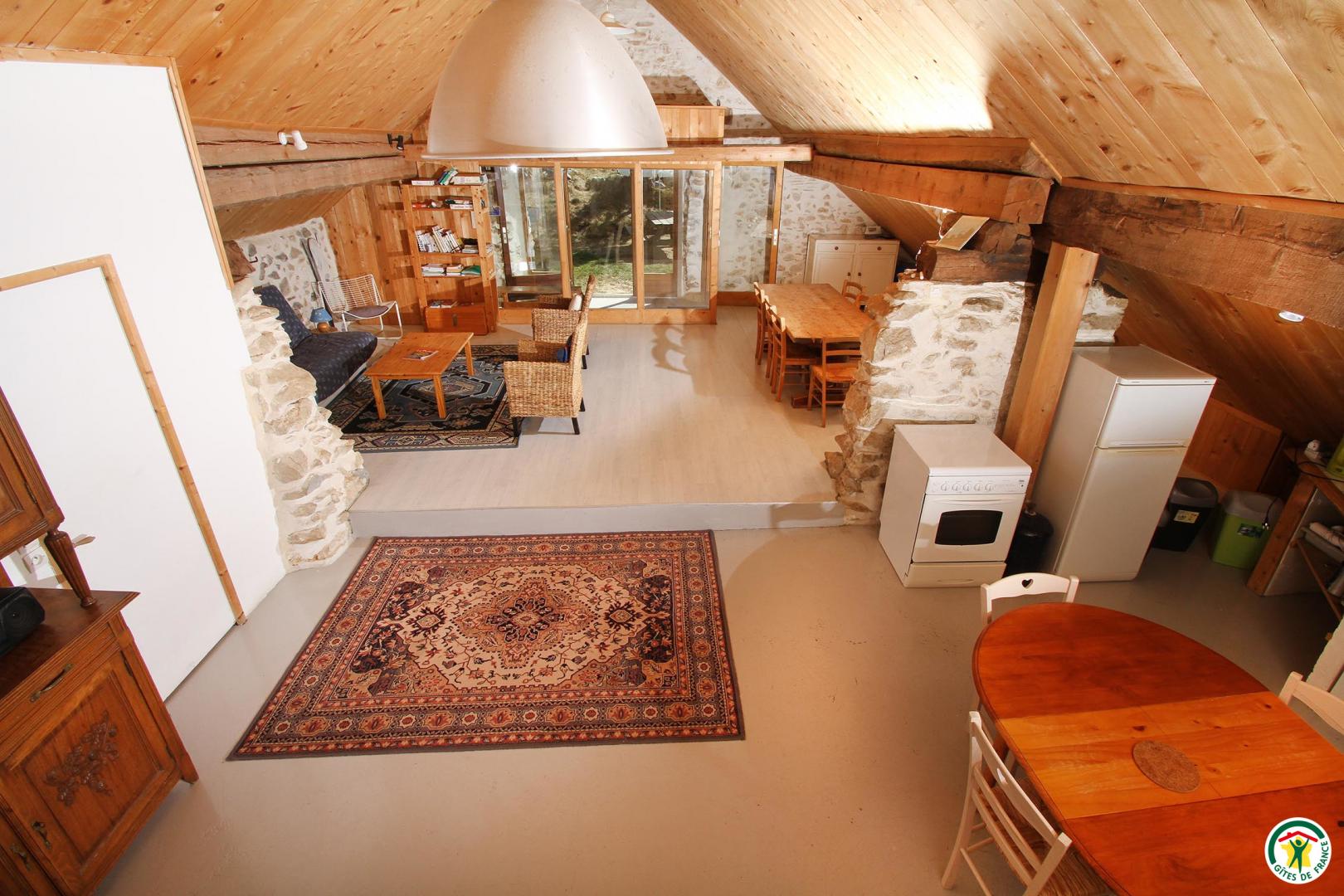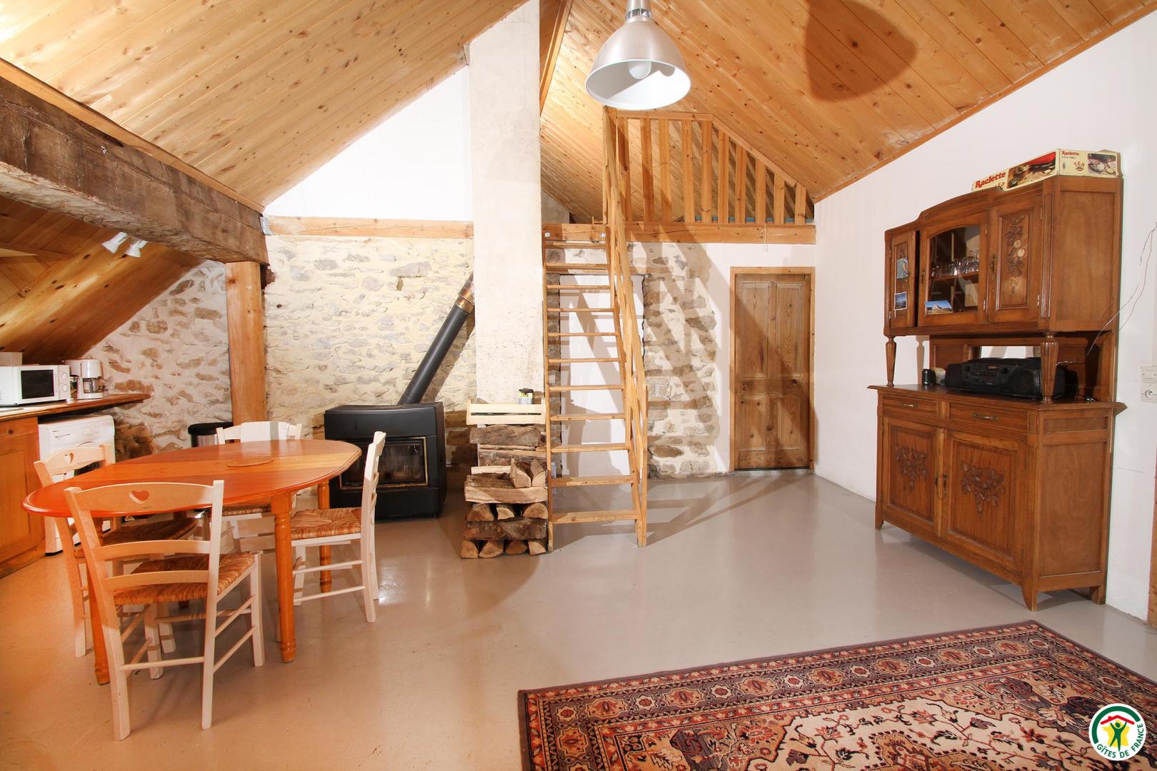 Grand séjour cuisine (clic-clac), 1 ch. (1x90, 1x140), mezzanine (1x90, 1x140), 2 salles d'eau, 2wc. Poêle à bois (bois fourni). De décembre à mars 50€ de suppl. pour charge de chauffage.