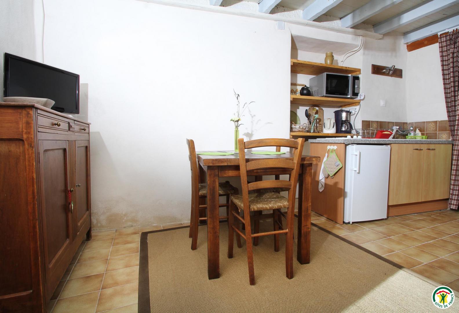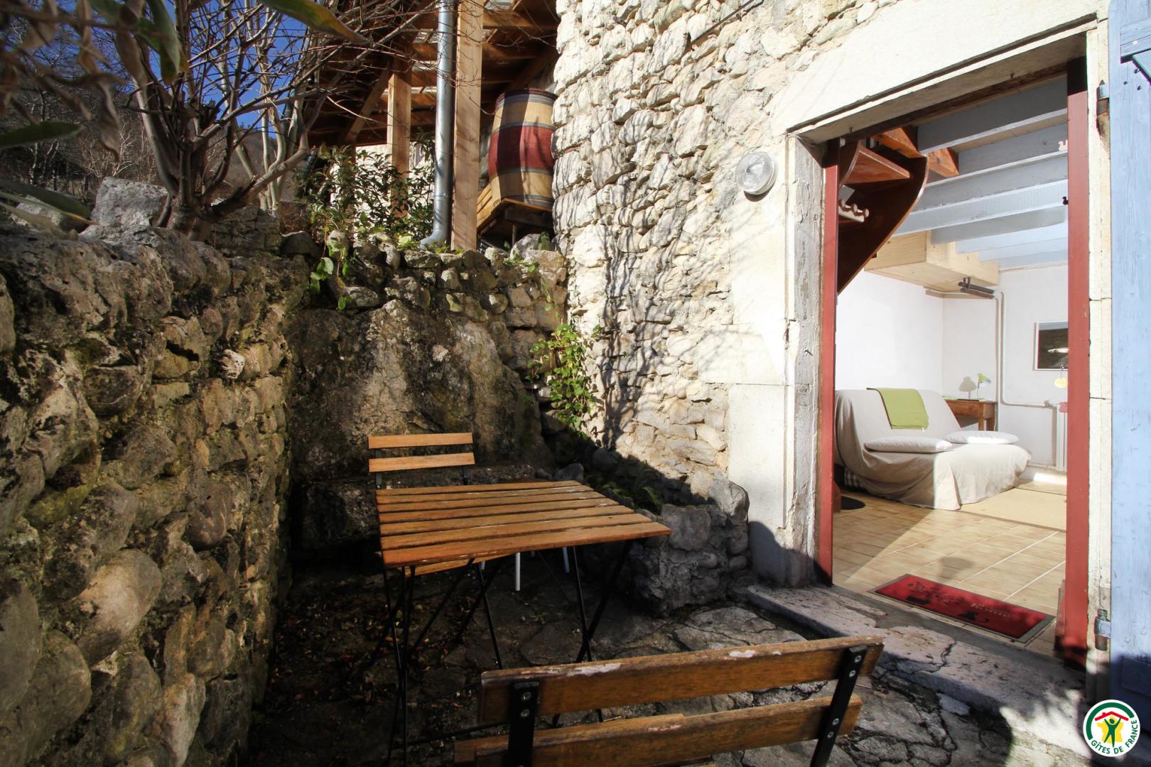 Rdc : cuisine/séjour (clic-clac). Etage : 1 chambre ouverte (1x140), salle d'eau. Jardin commun ombragé. Terrasse privée.