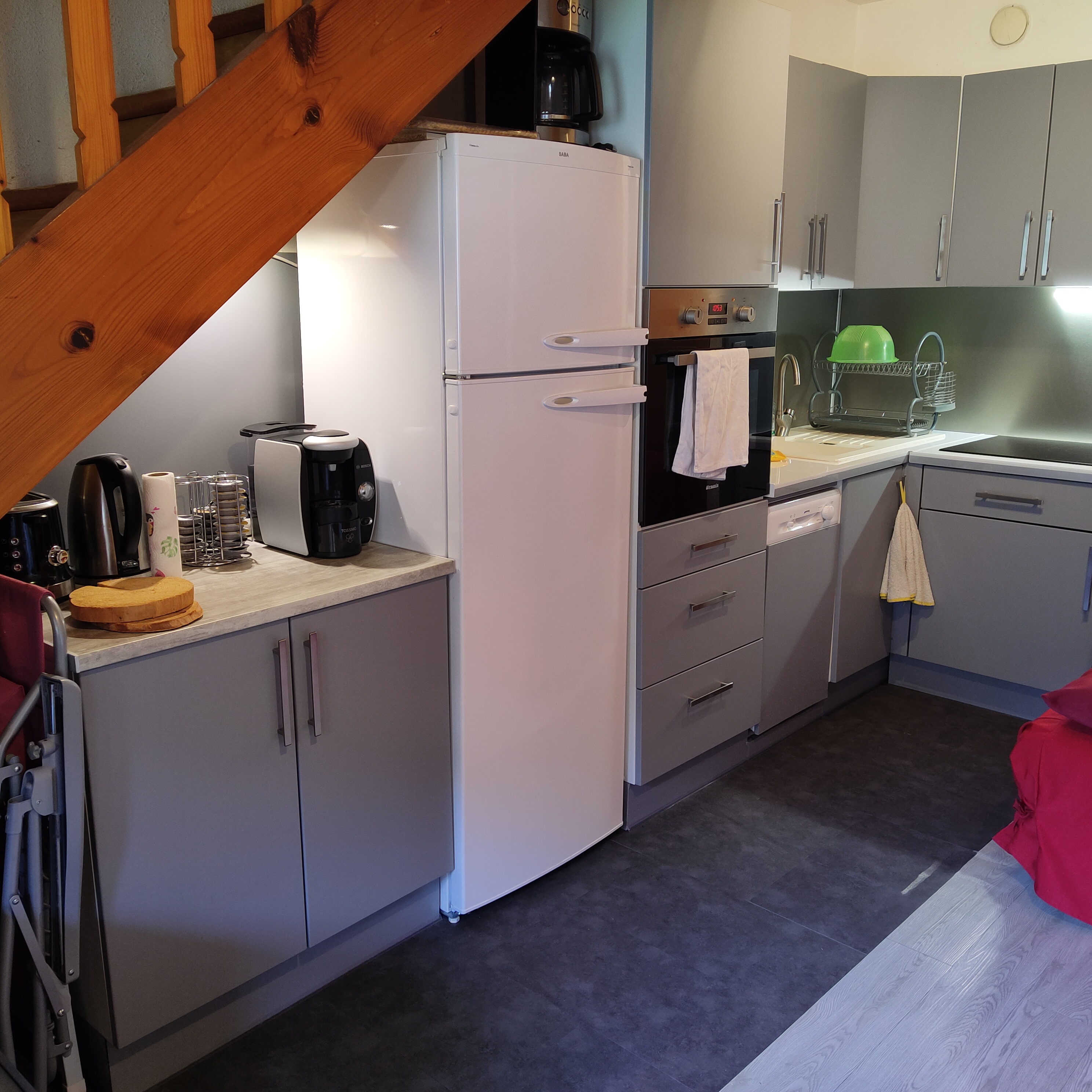 Appartement avec mezzanine 6 couchages (1 chambre double et dans la mezzanine 4x1 personne). Cuisine équipée avec plaques à induction (vaisselle adaptée), grand four, réfrigérateur congélateur, micro-ondes, cafetière électrique filtres et Tassimo, bouilloire, grille pain, lave-vaisselle. Séjour avec télévision satellite, box internet, canapé, table et chaises. Chambre double avec commode. Salle de bains avec douche, lave linge, sèche serviettes.