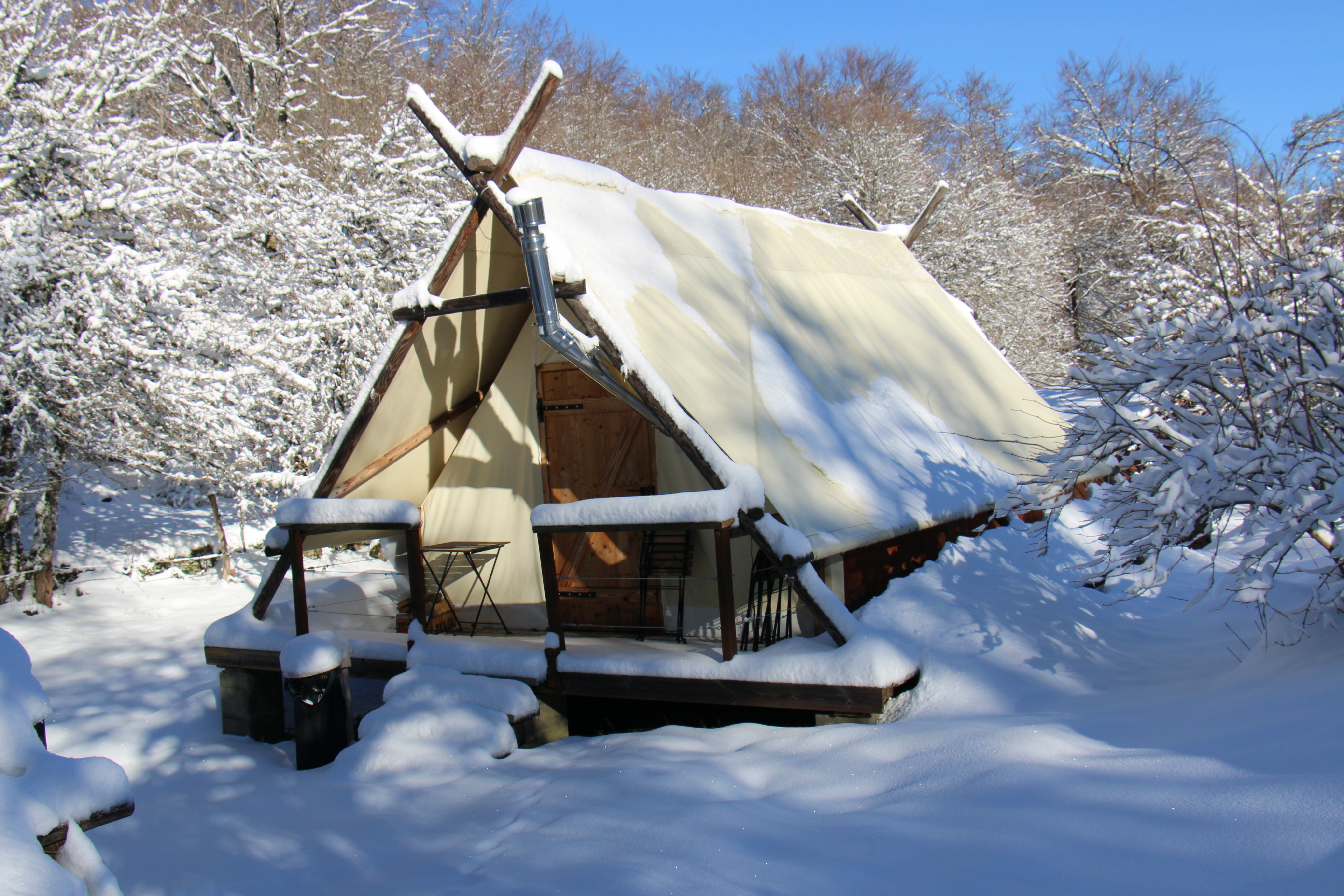 - 4 tentes de 7 personnes vous accueillent avec lits, table, poêles à bois